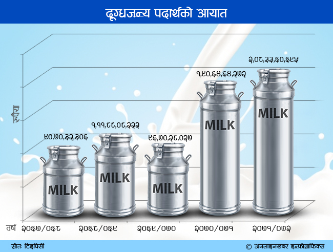 पाँच वर्षयताको तथ्यांकलाई हेर्दा ०६७/०६८ मा नेपालमा ९० करोड ७० लाख रुपैयाँको हाराहारीमा दूध तथा दुग्ध पदार्थको आयात हुन्थ्यो । ०७१/०७२ सम्म आइपुग्दा यो क्रम बढेर नेपालले २ अर्ब ८ करोड रुपैयाँ भन्दा बढीको दुग्ध पदार्थ आयात गर्न थालिसकेको छ ।