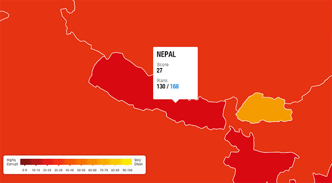 १३ माघ, काठमाडौ । धेरै भ्रष्टाचार हुने मुलुकको सूचीमा परेको नेपालको अबस्था हरेक बर्ष खस्किदै गइरहेको छ । भ्रष्टाचार विरुद्धको अन्तराष्ट्रिय संस्था ‘ट्रान्सपरेन्सी इन्टरनेशनल’ जारी गरेको सूचकांकअनुसार सन् २०१५ मा नेपालमा भ्रष्टाचार झनै बढेको पाइएको छ । यो अबधिमा नेपाल भ्रष्टाचार सूचकांकमा चार स्थान तल झरेको छ । सन् २०१४ मा नेपाल १२६ स्थानमा रहेको नेपाल गत बर्ष चार स्थान तल झर्दै १३० औं नम्बरमा पुगेको छ । सन् २०१२ मा १३९ औं स्थानमा रहेको नेपाल नेपाल सन् २०१३ मा केही सुधार भइ ११६ औं स्थानमा उक्लिएको थियो । तर, सन् २०१४ मा पुनः १० स्थान तल झर्दै १२६ औं स्थानमा पुगेको थियो ।ट्रान्सपरेन्सी इन्टरनेशनलले नेपालमा गरेको सर्वेक्षण र अन्य बिभिन्न संस्थाका सूचकांकसमेतलाई आधार मानेर हरेक बर्ष यस्तो सूची सार्वजनिक गर्ने गर्दछ । सबैभन्दा धेरै भ्रष्टाचार हुने १० मुलुक सूचकांकमा सवैभन्दा धेरै भ्रष्टाचार हुने मुलुकको सूचीमा पहिलो नम्बरमा परेको छ, सोमालिया । उत्तर कोरिया, अफगानिस्तान, सुडान, दक्षिण सुडान, एंगोला, लिबिया, इरान, भेनेजुएला, गुनिबिसाउ र हैटी रहेका छन् । भ्रष्टाचारका निवारणका सवै सूचकमा राम्रो अंक ल्याउने अर्थात सवैभन्दा कम भ्रष्टाचार हुने मुलुकको पहिलो स्थानमा युरोपेली मुलुक डेनमार्क परेको छ । दोस्रोमा फिनल्याण्ड, तेस्रोमा स्वीडेन, चौथोमा न्यूजिल्याण्ड, पाँचौमा नेदरल्याण्ड, छैटौंमा नर्वे, सातौं स्वीटजरल्याण्ड, आठौं सिंगापुर, नवौं क्यानडा र दशौं स्थानमा जर्मनी रहेका छन् ।