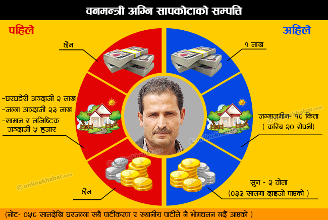 एमाओवादी स्थायी समिति सदस्यसमेत रहेका वनमन्त्री अग्नि सापकोटाको पनि सम्पत्ति विवरण रोचक छ । जनयुद्ध कालमा सापकोटाले पार्टीमा सम्पत्ति विवरण बुझाउने क्रममा भरेको फारममा यस्तो लेखिएको थियो- ‘०५८ सालदेखि घरजग्गा सबै पार्टीकरण र स्थानीय पार्टीले नै भोगचलन गर्दै आएको ।’