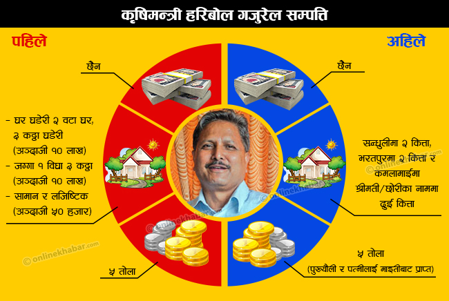 एमाओवादीका कोषाध्यक्षसमेत रहेका कृषिमन्त्री हरिबोल गजुरेलको सम्पत्ति विवरणमा भने विगत र अहिले खासै बेमेल देखिएको छैन । गजुरेलले पार्टीलाई विवरण बुझाउँदा भरेको फारममा आफूसित ५ तोला सुन रहेको उल्लेख गरेका थिए । अहिले पनि उनले ५ तोलाकै विवरण दिएका छन् ।