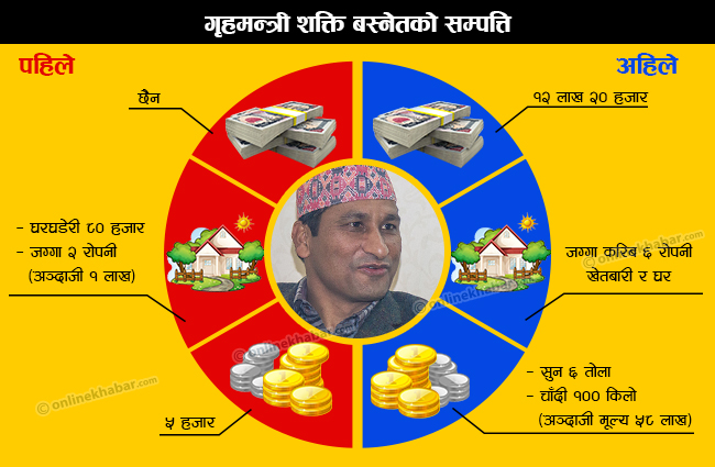 एमाओवादी नेता एवं गृहमन्त्री शक्ति बस्नेतको सम्पति विवरण पनि उस्तै रोचक छ । जनयुद्धकालमा पार्टीलाई सम्पत्ति बुझाउने बेलामा बस्नेतले आफूसँग पाँच हजार रुपैयाँको सुनचाँदी रहेको विवरण उल्लेख गरेका थिए ।