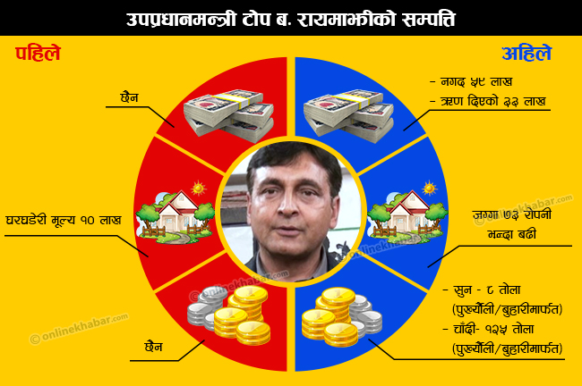 उपप्रधानमन्त्री एवं उर्जामन्त्री टोपबहादुर रायमाझी एमाओवादीका सचिव हुन् । उनले जनयुद्धकालमा आफ्नो सम्पत्ति पार्टीकरण गरेका थिए । टोपबहादुरले जनयुद्धकालमा पार्टीलाई बुझाएको सम्पत्ति विवरणमा १० लाख मूल्य बराबरको घर घडेरीबाहेक अन्य जग्गा नभएको उल्लेख गरेका थिए । तर, मन्त्री भएपछि सार्वजनिक गरिएको सम्पत्ति विवरणमा भने उनले ७३ रोपनीभन्दा बढी जग्गा देखाएका छन् ।