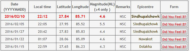 २८ माघ, काठमाडौं । राति सुतेका बेला पराकम्पले तर्साउने क्रम अझै रोकिएको छैन । बुधबार राति सिन्धुपाल्चोक केन्द्रबिन्दु भएर ४ दशमलव ६ रेक्टर स्केलको पराकम्प गएको छ । राति १० बजेर १२ मिनेट जाँदा पराकम्प गएको राष्ट्रिय भूकम्प मापन केन्द्रले जनाएको छ । भूकम्पको धक्का काठमाडौं उपत्यकामा पनि महसुस भएको थियो ।