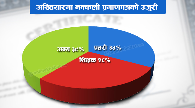 सरकारी सेवा प्रवेश र बढुवा तथा पदोन्नतिका क्रममा नै नक्कली सर्टिफिकेट पेश भएको अनुसन्धानबाट देखिएको छ । पुस्करका अनुसार विशेषगरी प्रहरी तथा शिक्षक र सार्वजनिक संस्थानका जागिरेहरु नक्कली सर्टिफिकेटको प्रयोगमा अब्बल देखिएका छन् । बितेका दुई आर्थिक वर्षमा अख्तियारले यससम्बन्धी १ सय ७६ वटा मुद्दा दायर गरेको छ । आर्थिक वर्ष ०७०/७१मा ८० वटा मुद्दा दायर भएका हुन् भने बितेका वर्ष ९६ वटा मुद्दा विशेष अदालतमा पुगेका छन् । यसमध्ये ५८ वटा मुद्दा प्रहरी र ४९ वटा शिक्षा क्षेत्रसँग सम्वद्ध छन् ।