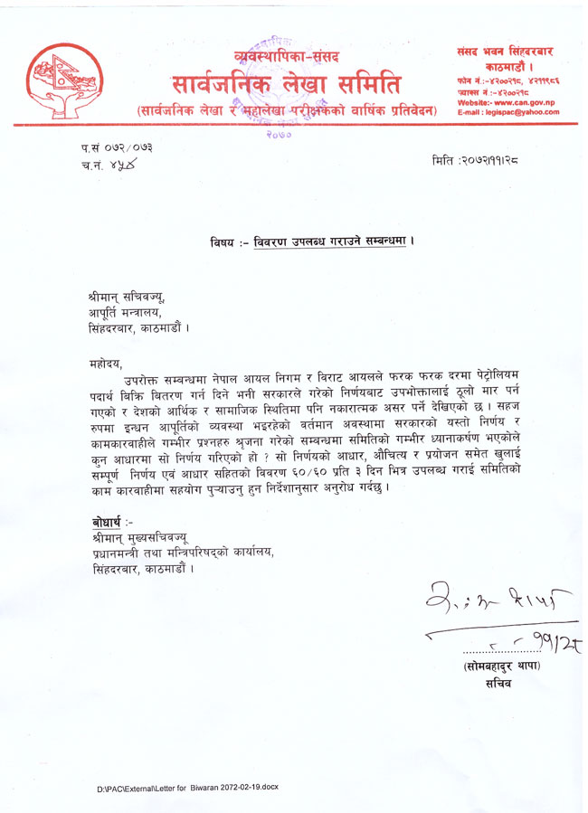 लेखा समितिले अापूर्ति मन्त्रालयलार्इ लेखेकाे पत्र हेर्नुस्